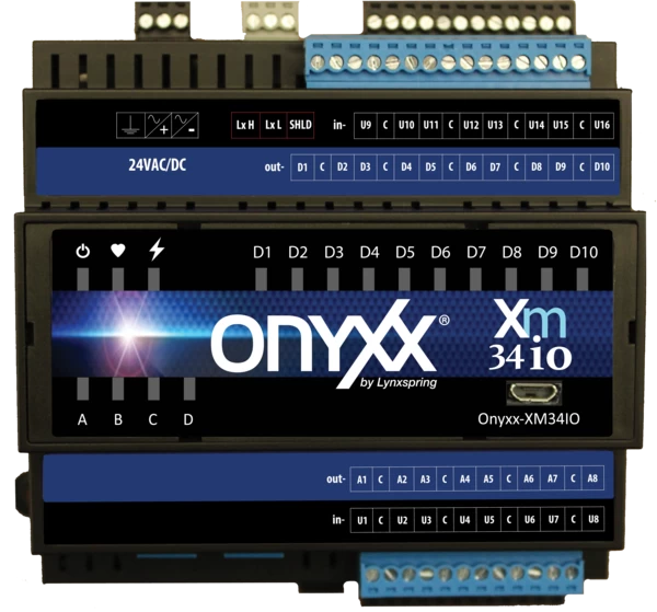 Lynxspring Onyxx-XM34IO : Like the Onyxx 534 Hardware, this Expansion Module includes 34 IO points: 16 Universal Inputs; 10 Digital Outputs; 8 Analog Outputs. Onyxx Network Connector and 24VAC Terminal Block. Works with JENEsys-EDGE534 and XM-IO34-B, up to 7 XM34IO's may be connected to the 534 for 306 total IO connections. Last XM34IO in comm bus must be terminated.