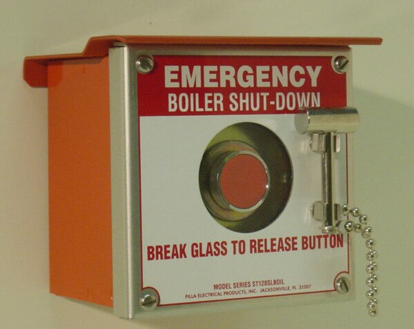 Pilla Electrical ST120SN3RXDSL(BS) : Emergency Break Glass Disconnect Operator Station, No Push Button - Auto Release When Glass Broken, Surface Mount Nema 3R Rainproof Enclosure, 12 Contact Block Capacity, Specific Label "Emergency - Boiler Shut Down" (Contact Blocks Purchased Separately)